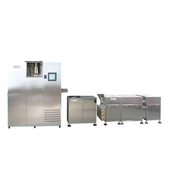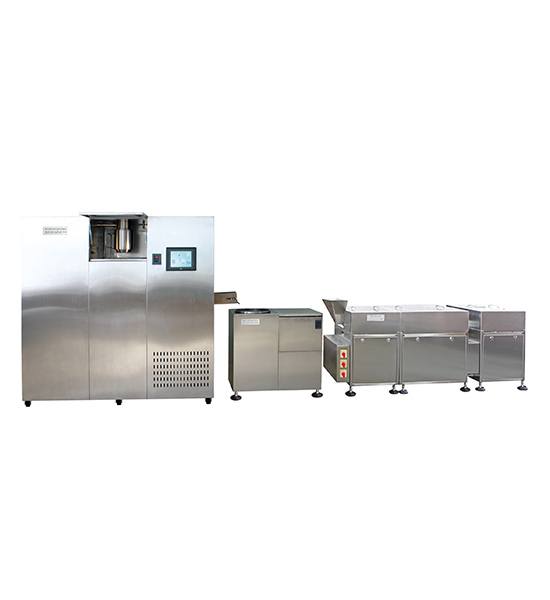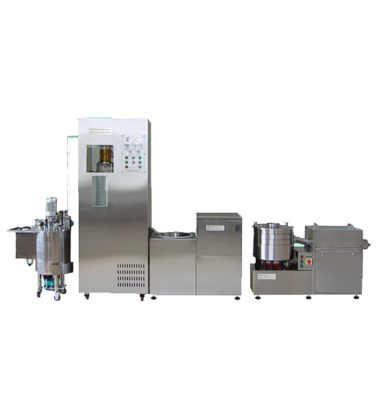 滴丸生產(chǎn)線,由200孔自動(dòng)化滴丸機(jī)和集丸離心機(jī)、旋轉(zhuǎn)式篩選機(jī)組成??筛鶕?jù)用戶(hù)的場(chǎng)地和產(chǎn)能要求,采用10個(gè)或更多的滴制系統(tǒng)(每個(gè)滴制系統(tǒng)100孔滴頭,可單獨(dú)控制使用)合并組合的方式,使滴頭數(shù)量達(dá)到1000個(gè)以上,由于制冷、PLC、觸摸屏、調(diào)料罐等采取集約控制,自動(dòng)化程度更高,與同樣產(chǎn)能的多條生產(chǎn)線相比,成本、價(jià)格都有降低。具有占地面積小、投資省、易操控、成品率高、用一條線的人力,可操控多條生產(chǎn)線等突出的優(yōu)勢(shì)。